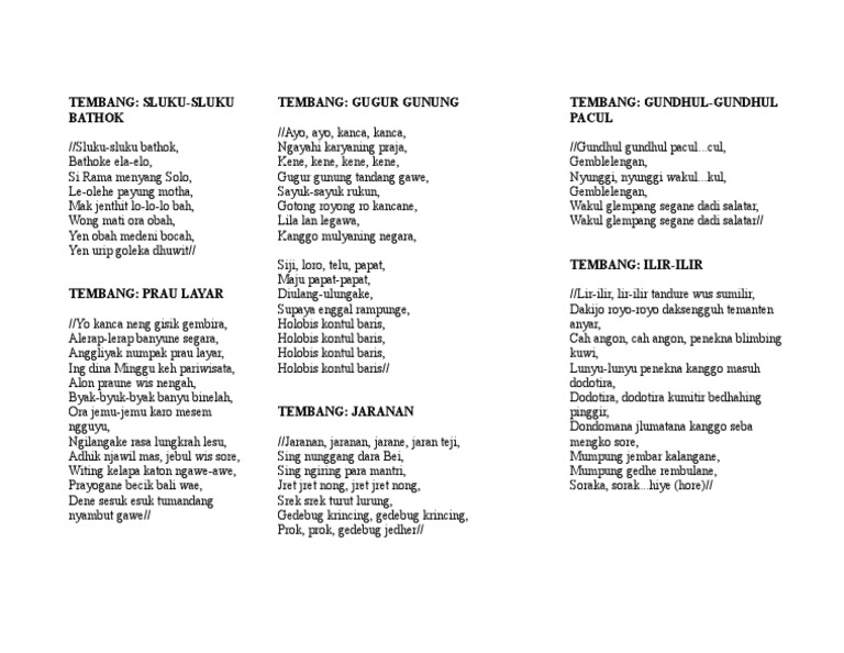 Tembang Dolanan World Languages Quiz Quizizz from quizizz.com Lafadz doa nurbuat yang asli dan benar. Berikut ini lirik lagu jaranan: Lagu ini berasal dari jawa tengah. Tahun ini adalah tahun dimana kerajaan kahuripan di bagi menjadi 2, yaitu jenggala dan panjalu. Lagu ini dibawakan dengan menggunakan benda yang menyerupai jaranan dalam menyanyikannya. Tidak hanya berkembang di jawa timur, mantra ini juga terdapat di jawa barat.nama lain dari jenis mantra ini di antaranya adalah pengasihan dan pelet.mantra ini erat kaitannya dengan ilmu gaib, metafisik, dan dunia paranormal Pawang jaranan melakukan ritual sebelum acara dimulai untuk meminta keselamatan. Atau bersamaan dengan kerajaan kahuripan dibagi menjadi 2 yaitu yaitu bagian timur kerajaan jenggala dengan ibukota kahuripan dan sebelah barat kerajaan panjalu atau kediri dengan ibukota dhahapura.
